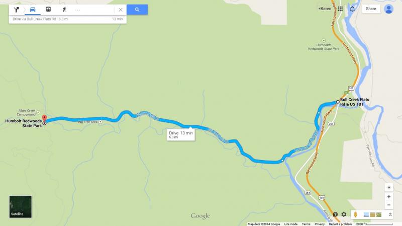 From the North on Hwy 101: Take exit 663 (Honeydew/South Fork). Take a right at the stop sign, follow Mattole/Bull Creek Road for five miles and watch for signs. Parking is near the Albee Creek Campground.